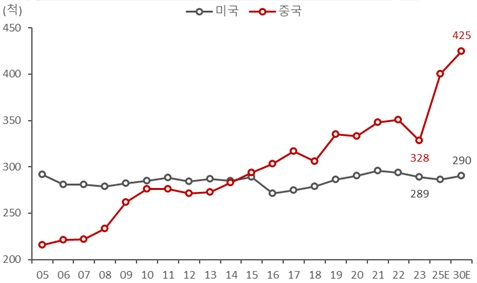 현재 중국의 전투용 함정 수는 328척으로 미국의 289척을 앞섭니다. 미 국방부는 중국이 현재와 같은 건함 속도를 유지할 경우, 2025년에는 400척, 2030년에는 425척까지 증가할 것으로 전망했습니다. 반면 미국의 전투함은 2025년 286척, 2030년 290척으로 예상되는 등 함정 보유량의 격차는 더욱 확대될 수밖에 없습니다. 중국이 지금과 같은 속도로 고성능 전투함을 대량 건조하면 미국의 해군력 우위가 깨지는 것은 시간문제로 보입니다.