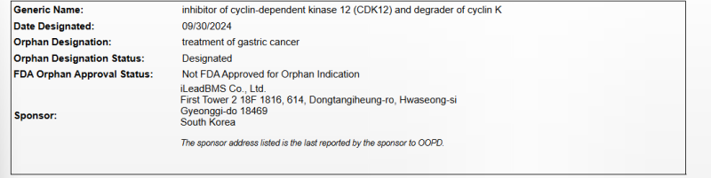 2024년 9월 30일 (미국시간) Gastric cancer에 대하여 희귀의약품 지정되었습니다.
