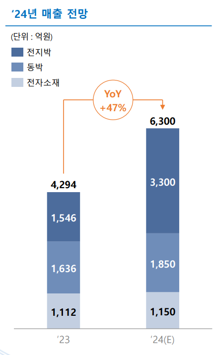 기업의 사업부문은 전지박, 동박, OLED 등을 포함한 전자소재 부문으로 나눠져 있다. 전지박 사업만이 △2022년 매출 1127억원 △2023년 매출 1546억원을 기록하며 매해 매출 확대를 이어가고 있다. 올해 예상 매출은 3300억원에 이른다. 공장 증설도 지속적으로 추진하고 있어, 전지박 사업 부문이 앞으로 성장 바로미터로 꼽힌다.