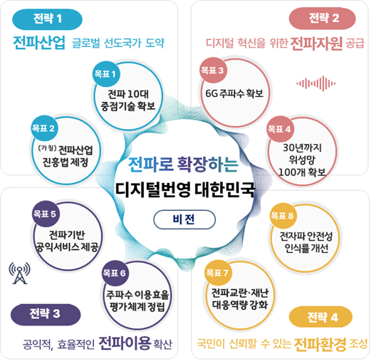 2028년까지 5년간의 전파활용 방안을 담은 이 계획은 전파산업 글로벌 선도국가 도약, 디지털 혁신을 위한 전파자원 공급, 공익적·효율적인 전파이용 확산, 국민이 신뢰할 수 있는 전파환경 조성 등의 4대 전략을 포함했다.