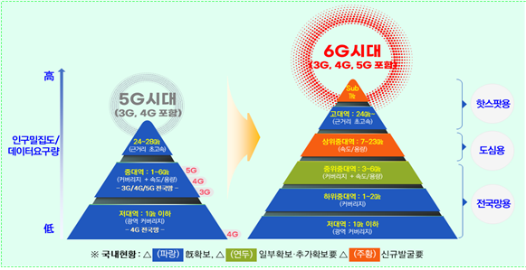 또, 지난해 세계전파통신회의에서 6G 후보 대역으로 채택된 3개 대역(4.4~4.8㎓·7.125~8.4㎓·14.8~15.35㎓)을 바탕으로 6G 주파수를 발굴·확보하고 이용 만료 예정인 3G·4G·5G 주파수 재할당, 광대역 주파수 확보 등을 추진한다.