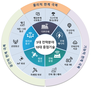 10대 중점기술은 ▲차세대 위성통신·초소형 사물인터넷(IoT) 위성(위성통신 분야) ▲공중통신·지중·수중통신(비지상통신 분야) ▲매질한계 극복통신·극고주파 통신·센싱(극한전파 분야) ▲무선전력전송·전파전력저감(전파에너지 분야 ) ▲이음5G·전파헬스케어(전파융합 분야) 등으로 구성된다.