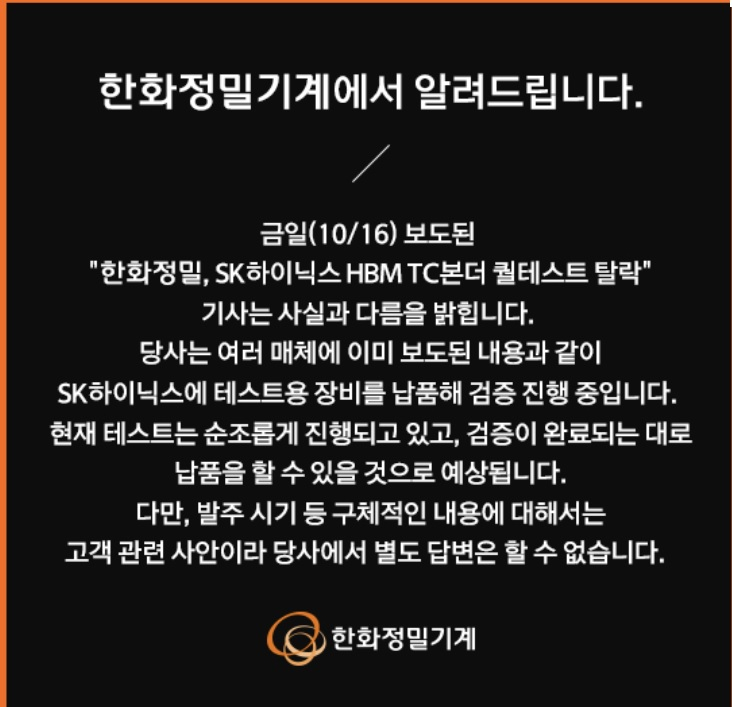한화정밀기계 관계자는 “‘SK하이닉스 HBM TC본더 퀄테스트 탈락’ 보도는 사실이 아니다”며 “당사가 공식적으로 보도자료를 배포하지는 않았으나, 여러 매체에 보도되었던 것처럼, SK하이닉스에 테스트용 장비를 납품해 검증을 진행 중”이라고 말했다.