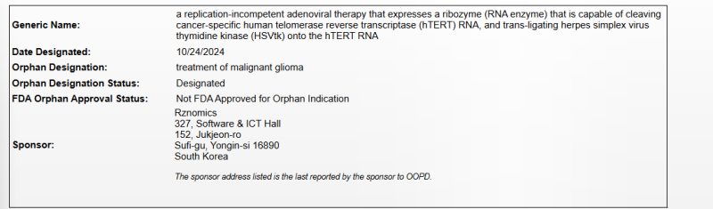 2024년 10월 24일 (미국시간) malignant glioma에 대하여 희귀의약품 지정되었습니다.