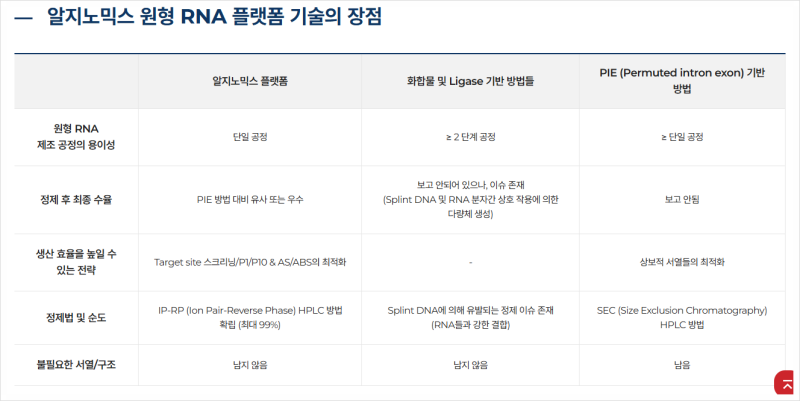 알지노믹스의 핵심기술은 크게 두 가지로, RNA 치환 효소 및 원형 RNA입니다.