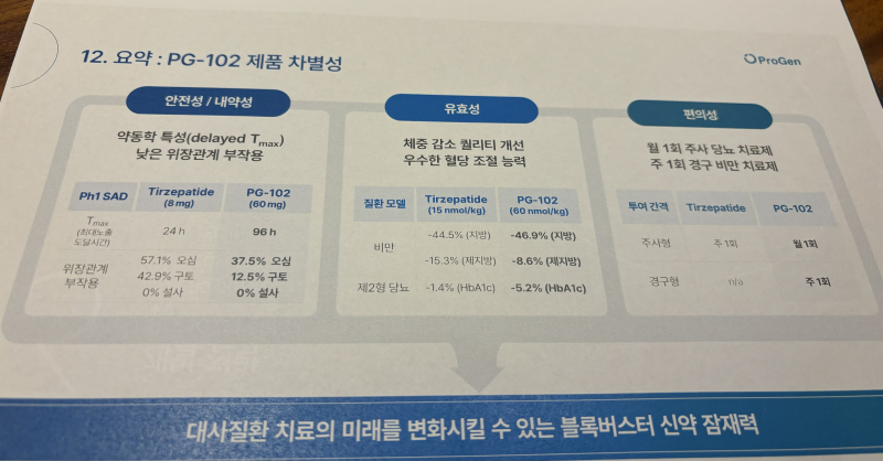 프로젠은 PG-102를 당뇨병을 적응증으로 월1회 주사제형과 비만을 적응증으로 주1회 경구용 약물로 개발할 계획이다.