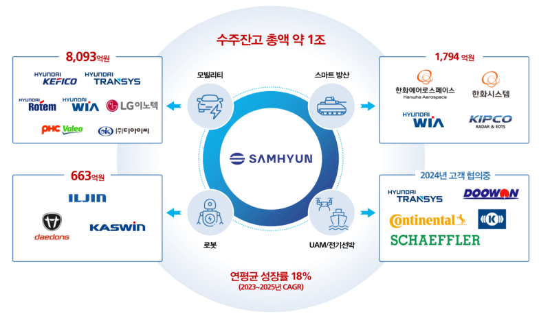 18일 회사와 금융투자업계에 따르면 삼현의 사업 부문은 ▲친환경차 부품 ▲방산 부품 ▲로봇 부품 등으로 나눠져 있으며 2024년 부문별 예상 매출액 비중(출처 한국투자증권)은 자동차 87.7%, 방산 9.1%, 로봇 3.1% 등이다.