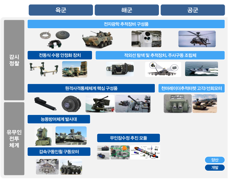 세부적으로 방산 부문은 ▲전자광학 추적장비(EOTS) 주요 부품 ▲천마레이더 추적터렛 고각/선회 모터 ▲전동식 수평 안정화 장치 ▲K-9 자주포 방위각 직구동 모터 등이 대표적인 제품 포트폴리오다.