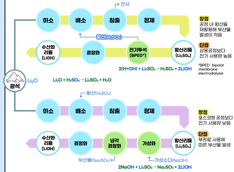 1공장은 황산리튬 용액을 전기투석해 수산화리튬으로 전환하는 형태로 가동된다. 2공장은 황산리튬 용액과 수산화나트륨을 반응시켜 수산화리튬을 추출하는 방식으로 운용된다.