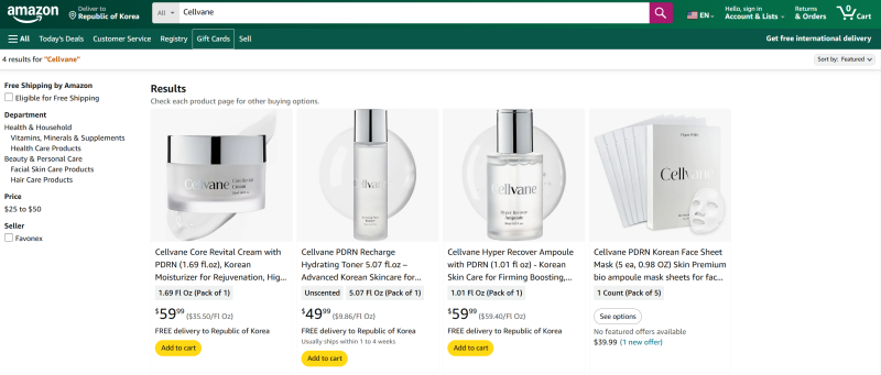 제론셀베인이 아마존에 공식 입점한 폴리데옥시리보뉴클레오티드(PDRN) 기반 기능성 화장품 ‘셀베인 코스메틱’은 ▲셀베인 리차지 스킨 부스터 ▲셀베인 하이퍼 리커버 앰플 ▲셀베인 코어 리바이탈 크림 ▲셀베인 바이오 앰플 마스크로 북미 시장 공략을 본격화할 예정이다.