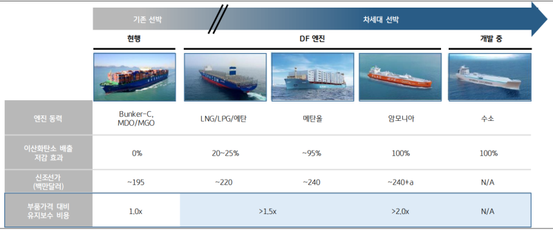 KB증권의 리포트에 따르면 기존 고유황유 단일 연료로 가동되는 엔진의 유지보수 비용이 1이라면 LNG나 메탄올 D/F는 1.5배, 암모니아 D/F는 2배 이상인 것으로 파악된다.