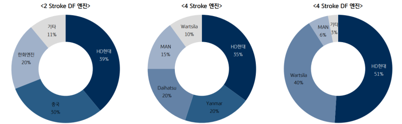 또한, HD현대그룹이 생산하고 있는 선박 엔진이 ▲2 스트로크 D/F엔진 ▲4 스트로크 엔진 ▲4 스트로크 D/F 엔진 등 다양한 부문서 35~55% 수준의 점유율을 차지하고 있다는 사실도 HD현대마린솔루션에게 호재라고 볼 수 있다.