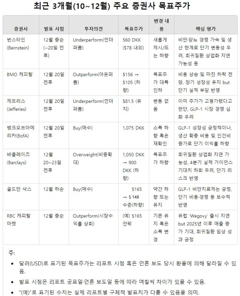 최근 3개월 노보노디스크의 글로벌 증권사 목표주가와 12월20일 변수