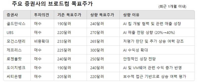 UBS는 브로드컴의 목표주가를 기존 220달러에서 270달러로 상향 조정하고, '매수' 등급을 유지했다. UBS는 AI 매출 전망이 20%에서 40%로 증가할 것으로 예측했다.