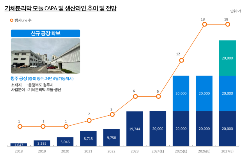 자료에 따르면 에어레인의 기체분리막 모듈 생산능력은 지난해 말 연산 2만개이며, 2026년 4만개, 이후 6만개 수준으로 확장될 것으로 전망된다.