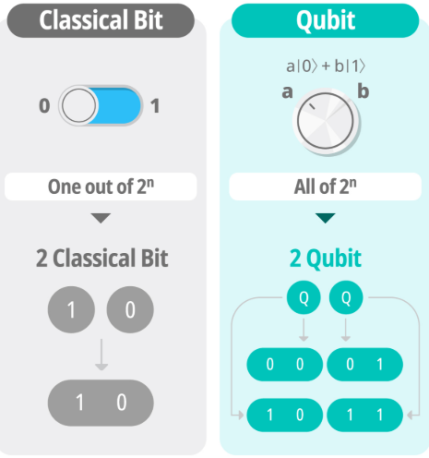 기존의 고전컴퓨터는 0 또는 1이라는 값을 가진 비트를 연산의 기본단위로 사용하는데 이 비트는 오직 1개의 상태만 가질 수 있습니다. 하지만 양자컴퓨터는 양자역학의 원리를 활용해 0과 1의 상태를 동시에 가지는 퀀텀비트 즉 큐비트를 사용합니다.