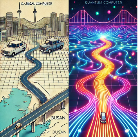 이런 특성 때문에 목적지에 가기 위한 가장 빠른 길 찾기를 한다고 했을때, 고전컴퓨터는 경로 전부를 각각 찾아 최단 거리를 찾습니다. 반면, 양자컴퓨터는 한꺼번에 출발해 최단 경로를 확인하기 때문에 속도 면에서 월등합니다. 미래 방향성이 논리적 큐비트인 셈입니다.