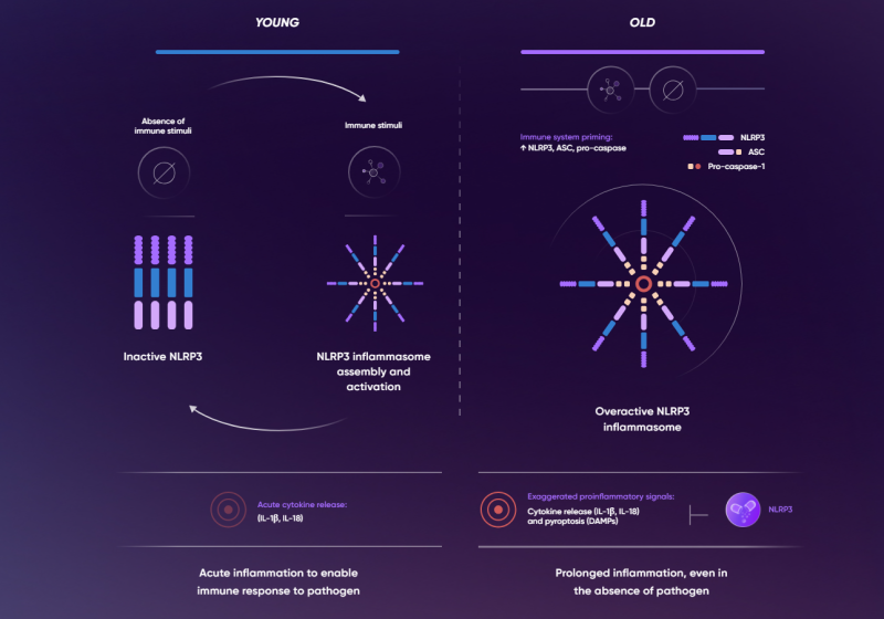 NLRP3는 나이가 들어가면서 발생하는 만성염증의 주요 매개체로 알려졌다. NLRP3는 감염 또는 조직손상에 반응하는 염증복합체의 주요 구성요소다. 특히 NLRP3의 발현 수치는 노인층에서 젊은층과 비교해 상대적으로 높으며, 이는 모든 원인으로 인한 사망률과 관련이 높다는 것이 회사측의 설명이다.