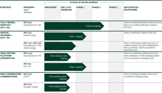 비만 환자 및 과체중인 임상참여자를 대상으로 진행중인 MET-097i의 임상2b상 중간분석 결과는 올해 중반에 도출될 예정이다. 또한 월1회 투여하는 MET-097i의 임상2b상 초기 데이터는 올해말에서 내년초 사이에 발표된다.