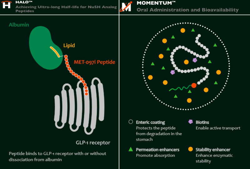 멧세라의 반감기∙생체이용률 개선 플랫폼 기술은?멧세라는 펩타이드 약물의 지속기간을 늘리는 할로(HALO) 플랫폼과 생체이용율(Bioacailability)를 높여 경구용이로 개발이 가능하게 해주는 모멘텀(MOMENTUM) 플랫폼 기술을 가지고 있다.