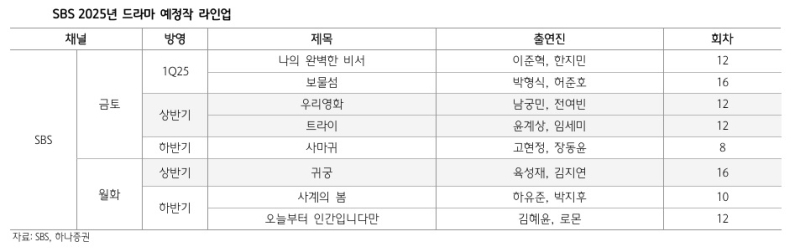 김회재 대신증권 연구원은 “SBS는 2018년까지 연간 20편 수준의 드라마 제작 후, 19~23년 11편 수준으로 급감한 바 있다”며 “2023년 9편, 2024년 8편에서 올해는 현재 확인된 것만 금토 8편, 월화 5편 등 13편에 달한다”고 설명했다.
