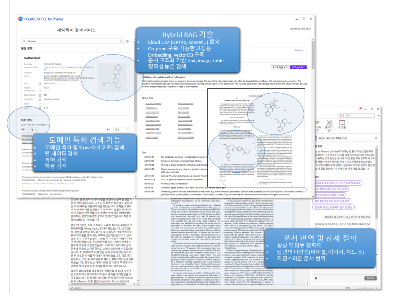 해당 모델의 주요특징은 하이브리드 RAG 기술을 적용해 기업의 내부망 환경에 맞춰 제약 도메인에 특화된 물질 정보 검색, 화학식 이미지 분석, 특허 문서 내용 요약 및 번역 기능을 제공한다.