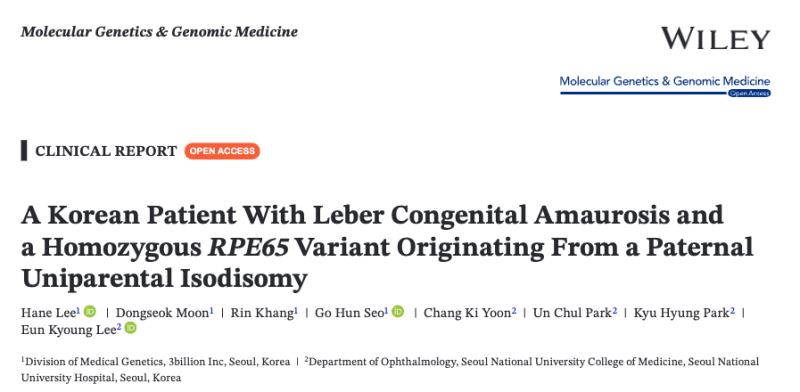 쓰리빌리언은 7일 이은경 서울대병원 교수팀과 함께 레버 선천성 흑암시(Leber Congenital Amaurosis, LCA)를 진단한 연구결과를 국제학술지 ‘Molecular Genetics and Genomic Medicine’에 게재했다고 밝혔다.
