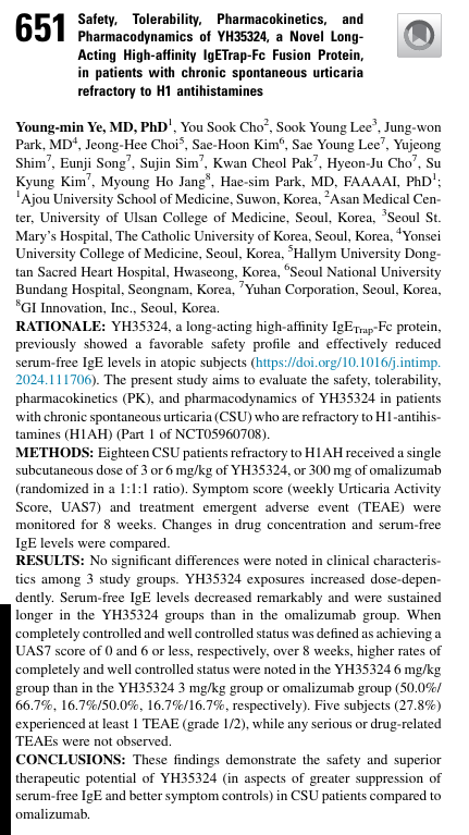 이번 결과에 대해 연구팀은 “졸레어와 비교해 CSU 환자에게서 YH35324가 혈중유리 IgE 억제와 더 나은 증상개선 측면에서 안전성과 우수한 치료제로의 가능성을 보여준다”고 분석했다.