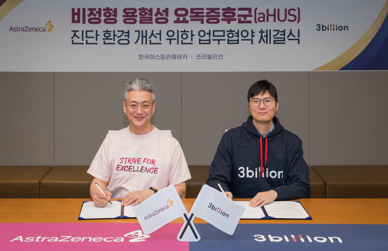 쓰리빌리언은 17일 한국아스트라제네카와 희귀질환 중 하나인 비정형용혈성 요독증후군(atypical Hemolytic Uremic Syndrome, aHUS) 환자의 신속 진단을 위한 유전자 검사 협력에 대한 업무협약(MOU)을 체결했다고 밝혔다.