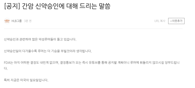 "미국 식품의약국(FDA)는 아직 간암 신약에 대해 어떤 결정도 내린게 없으며, 결정통보가 오는 즉시 유뷰트를 통해 공지할 계획이니 루머에 휘둘리지 않기를 당부드린다"