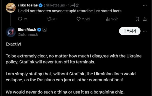 머스크의 이 글은 그가 스타링크를 빌미로 우크라이나를 협박하고 있다는 다른 엑스 사용자의 글에 반박하면서 올린 글이다.