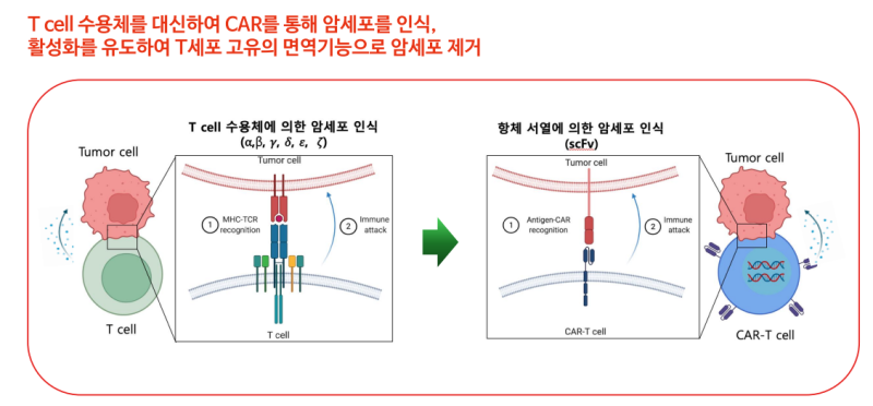 CAR-T는 암세포에서 발현되는 특정 타깃을 대상으로 T세포를 활성화하도록 설계해 공격하는 기전의 약물이다. B세포에서 발현되는 CD19, BCMA를 타깃한 제품이 시판되고 있다.