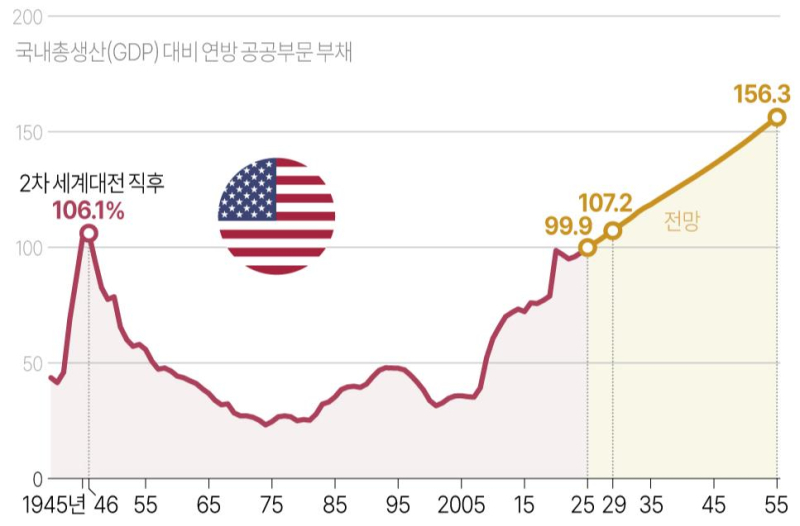미국 의회예산처(CBO)는 27일(현지시간) 발표한 향후 30년(2025∼2055년) 장기 예산 전망에서 2055년에는 부채가 GDP의 156%에 도달하고 그 이후에도 계속 증가할 것으로 예측했다.