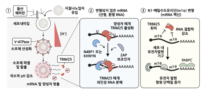 이 TRIM25 단백질은 N1-메틸수도유리딘 변형 염기에는 결합력이 크게 떨어져 mRNA를 분해하지 못하는 것으로 분석했다.