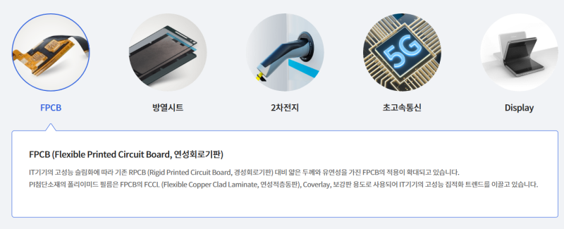 4마이크로미터(㎛) 두께인 초극박 PI필름은 회사의 연성회로기판(FPCB) 사업 부문에 포함되며, 이 부품을 활용하면 스마트폰·태블릿의 두께 감소, 내열성·내구성·절연성 확보 등의 효과를 얻을 수 있다.
