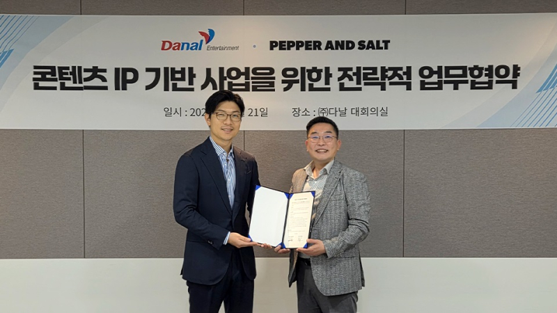 다날엔터테인먼트는 22일 마케팅 솔루션 기업인 페퍼앤솔트와 전략적 업무협약(MOU)을 체결했다고 밝혔다. 이번 협약은 콘텐츠 IP를 활용한 굿즈 개발과 유통, 팝업스토어 운영 등 신규 사업 모델을 공동으로 구축하기 위해 추진됐다.
