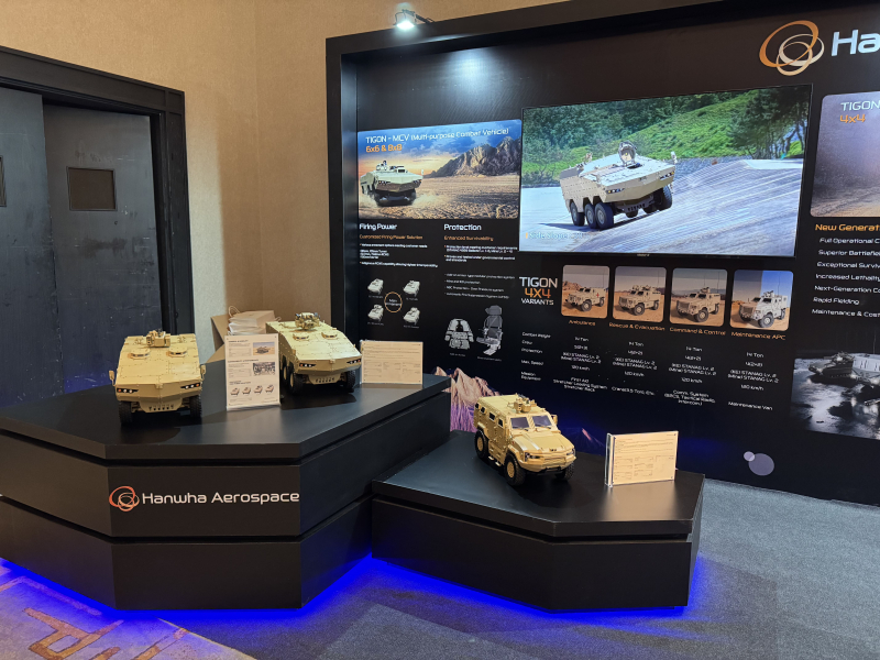 한화에어로스페이스는 독자 개발한 ‘타이곤(TIGON) 차륜형 장갑차’를 중심으로 8x8, 6x6, 4x4 플랫폼을 전시했으며, 칠레 육군의 차륜형 장갑차 사업 참여를 위한 준비에 박차를 가하고 있다.