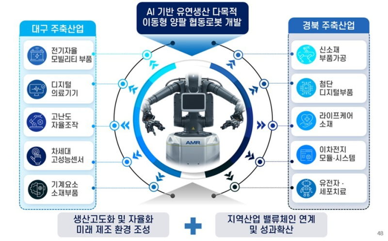 사업 과제명은 ‘AI 기반 유연생산용 다목적 이동형 양팔 협동로봇 시스템 개발’이다. 총사업비는 2년간 약 89억원 규모이며, 2025년 4월부터 2027년 3월까지 수행된다. 초광역권 메가시티의 산업 가치사슬을 강화하고, 지역 로봇산업의 경쟁력을 높이는 것이 핵심 목표다.