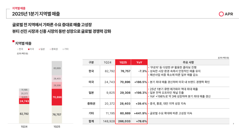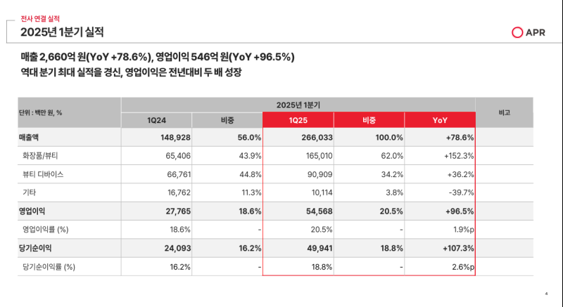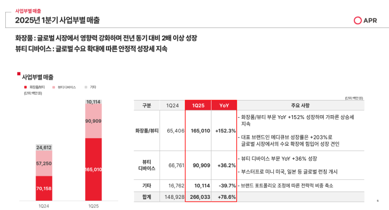 - 화장품과 뷰티디바이스 전 부문이 두 자릿수 이상의 높은 성장률을 기록하며, 1분기 기준 사상 최대 실적을 달성.