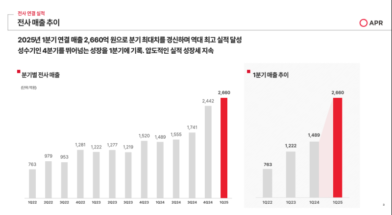 - 2025년 1분기 연결 기준 매출은 2,660억 원으로, 분기 기준 역대 최대 수준 기록.
