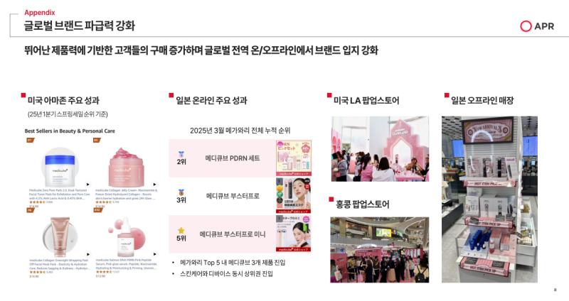 - 아마존·메가와리 등 주요 이커머스 채널에서 순위권을 유지, 일본 오프라인 매장 확대 및 글로벌 B2B 채널 확장도 병행 중.