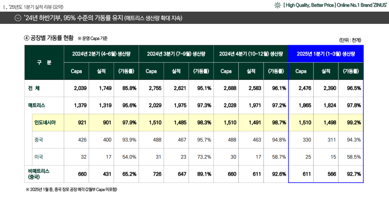- 인도네시아 공장 중심으로 생산 확대 지속 중