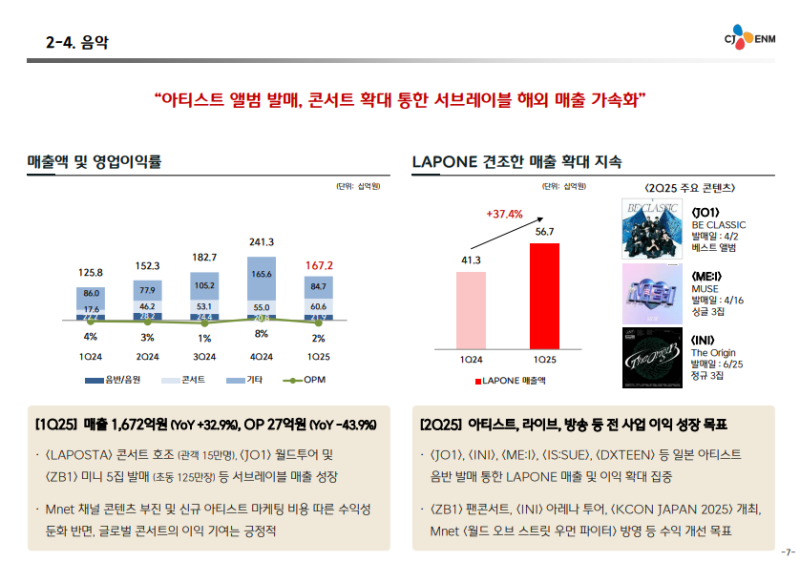 · 2025년 2분기 라이브 콘서트 및 음반 활동 확대, 매출 및 수익성 개선 병행