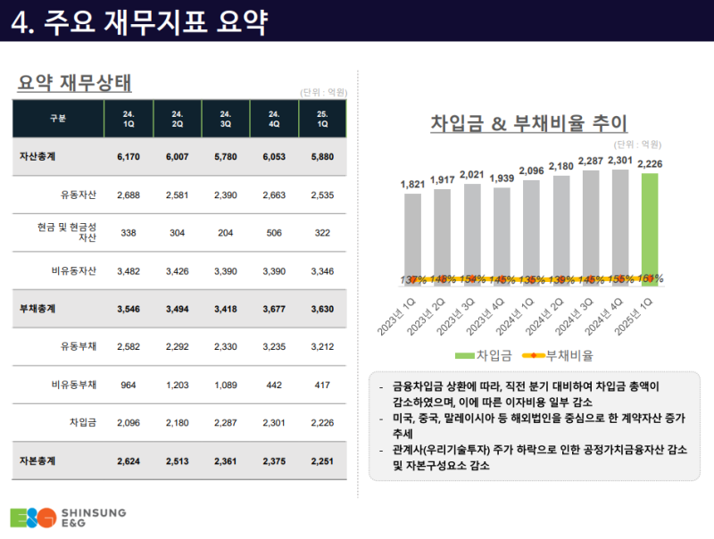 · 부채총계는 차입금 감소 등으로 소폭 감소했으나, 공정가치금융자산 및 자본 구성요소 감소로 인해 순자본이 줄며 부채비율은 상승