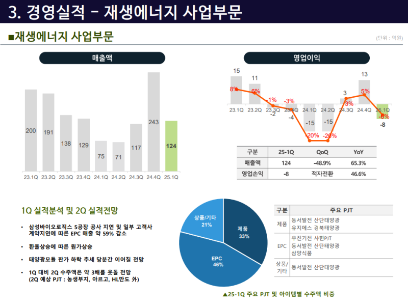 · 당초 1분기 착공 예정이었던 바이오기업 태양광 프로젝트는 일정 지연 및 인허가 이슈로 EPC 매출이 이연