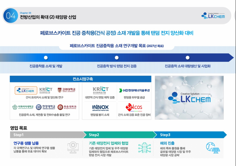 또한 엘케이켐은 우주 태양전지 전문기업 플렉셀스페이스과도 ▲우주 태양전지 셀의 핵심 물질 공급 ▲페로브스카이트 성능 향상 ▲우주 환경 검증 등을 공동으로 진행하고 있다.