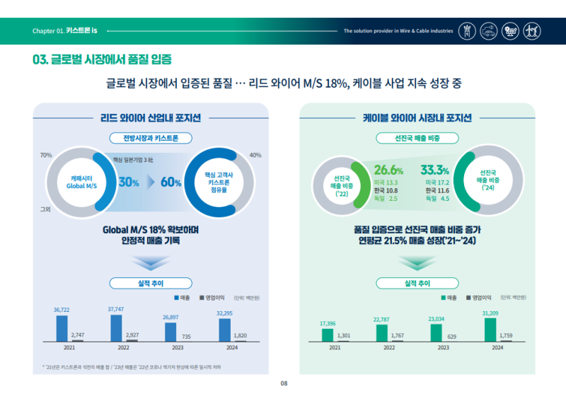 • 케이블 와이어는 북미·유럽 중심으로 확대되며, 선진국 매출 비중은 33.3%까지 상승.