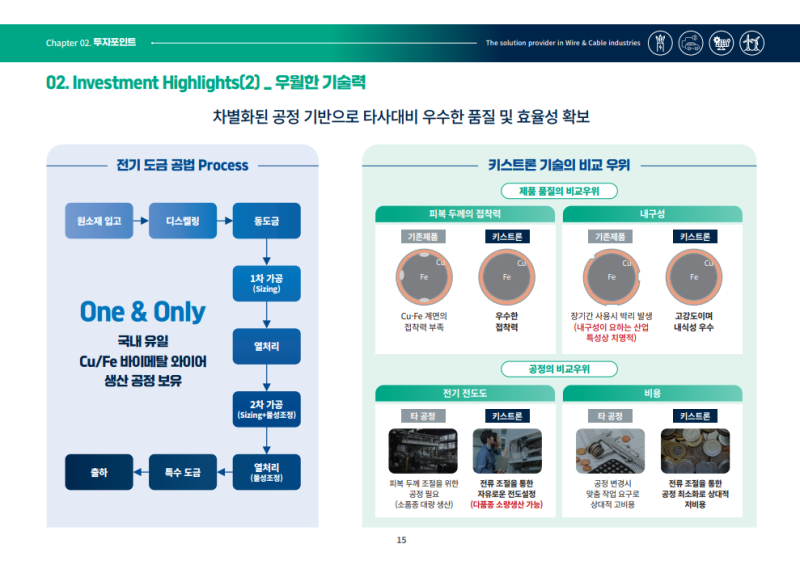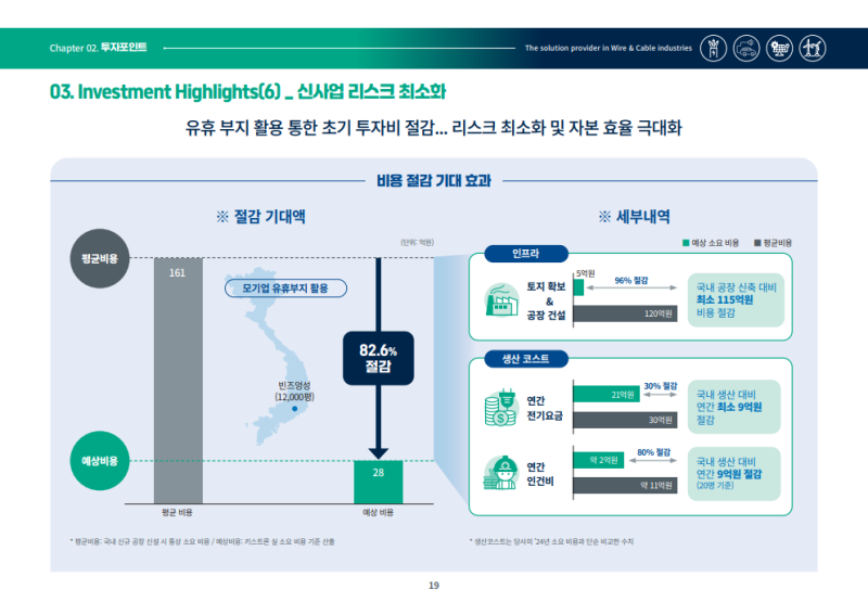 • 자동차 열선용 MCF, 모터권선용 CCA 등 신규 고부가 제품 확대 추진 중이며, 모기업 부지를 활용한 임대 방식으로 초기 투자 비용의 약 83% 절감 구조 확보.