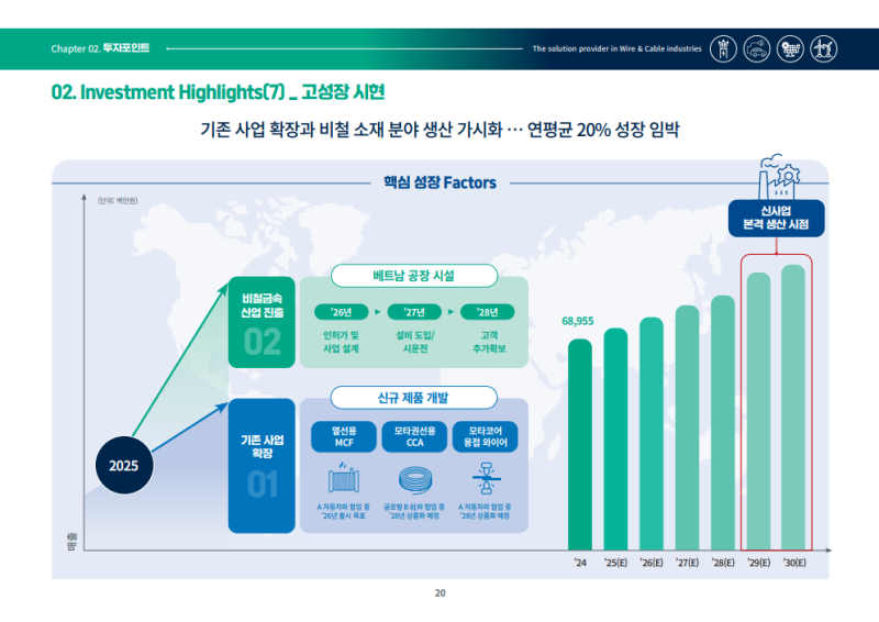 • 기존 사업 기반에서 자동차 열선용 MCF, 모터 권선용 CCA, 모터코어 용접 와이어 등 고부가 소재 개발 및 설비 투자를 지속 추진할 계획.