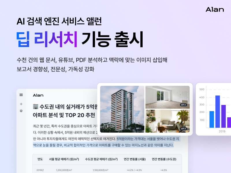 앨런 딥 리서치는 폭넓은 웹 검색은 물론, 필요시 부동산 전문 유튜브 영상까지 분석한 뒤 조사 방향을 유연하게 조정해, 최신 경향을 반영한 깊이 있고 정확한 분석을 제공한다. 보고서에는 시장 동향을 시각적으로 보여주는 그래프 이미지도 포함된다.